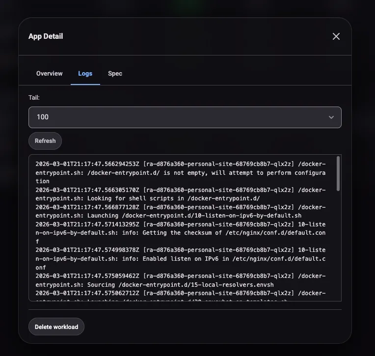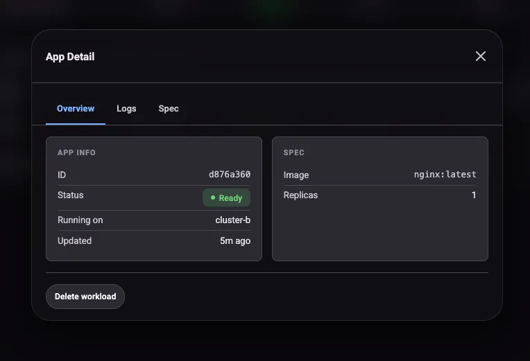 Clicking into a workload opens a detail modal with three tabs. Overview shows replica status, image, and resource requests. Logs streams pod output from the executing cluster. Spec shows the full workload definition as submitted. The logs tab is handy for debugging startup failures without needing to kubectl exec into the remote cluster.