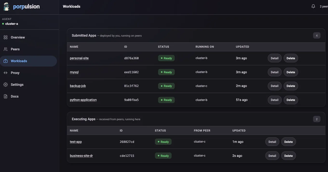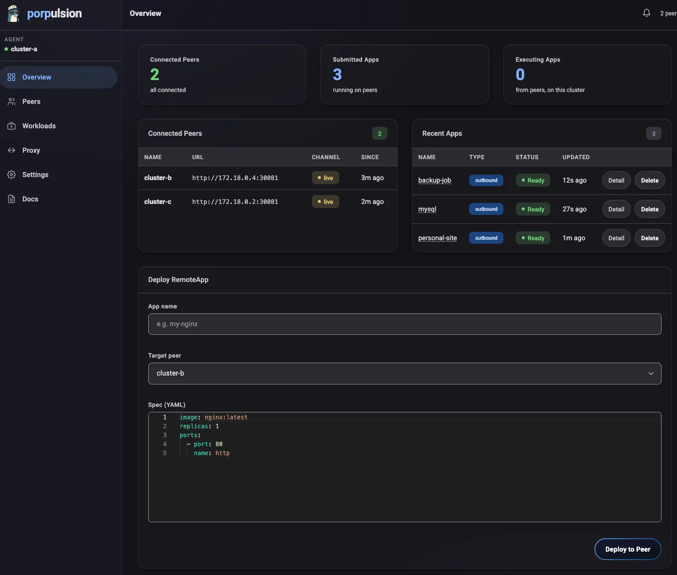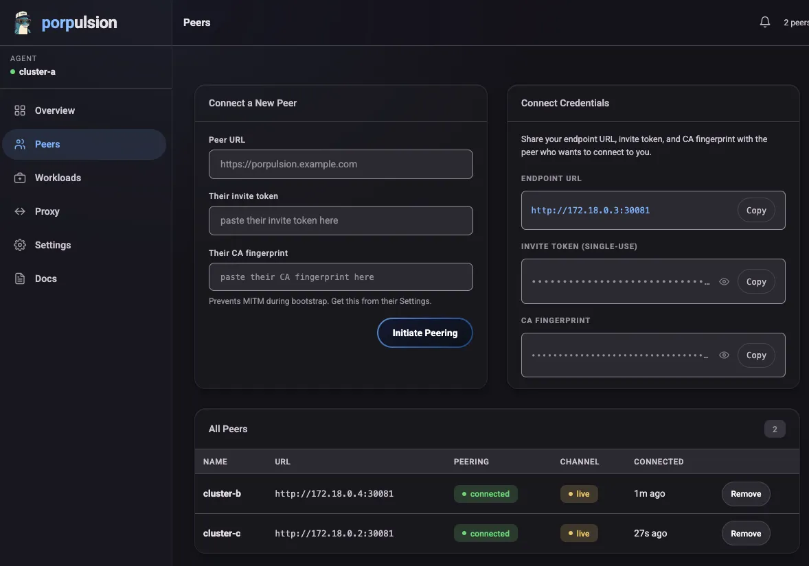 That’s what Porpulsion is. It’s a lightweight, decentralized Kubernetes connector. Each cluster runs a small Python agent. Agents peer with each other through a one-time certificate exchange, then stay connected over a persistent WebSocket channel secured with mutual TLS. Once peered, you can deploy containerized workloads to any peer cluster directly from the dashboard with no kubectl context switching, no shared control plane, and no extra infrastructure.