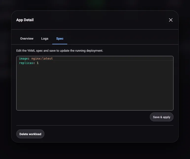 You can scale, update the spec, or delete the workload at any time from the Workloads page.