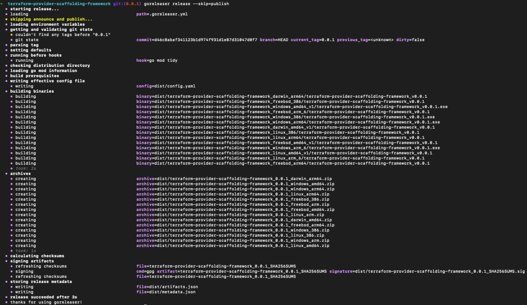 Ensure your goreleaser.yml configuration includes settings for multi-architecture support and signing. This file should live at the provider’s root, next to your main codebase.